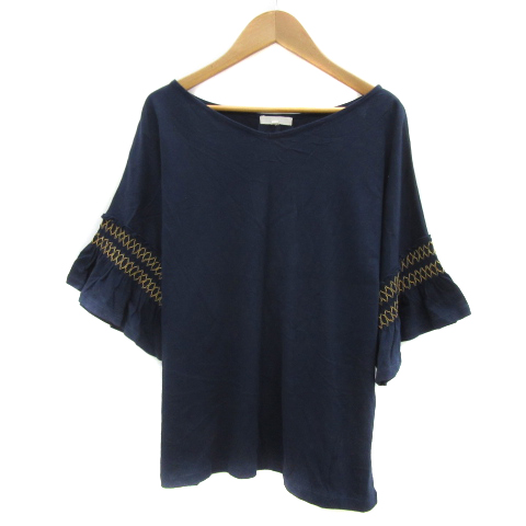【中古】スタディオクリップ カットソー 五分袖 Vネック 無地 刺繍 M 紺 ネイビー 黄色 イエロー レディース