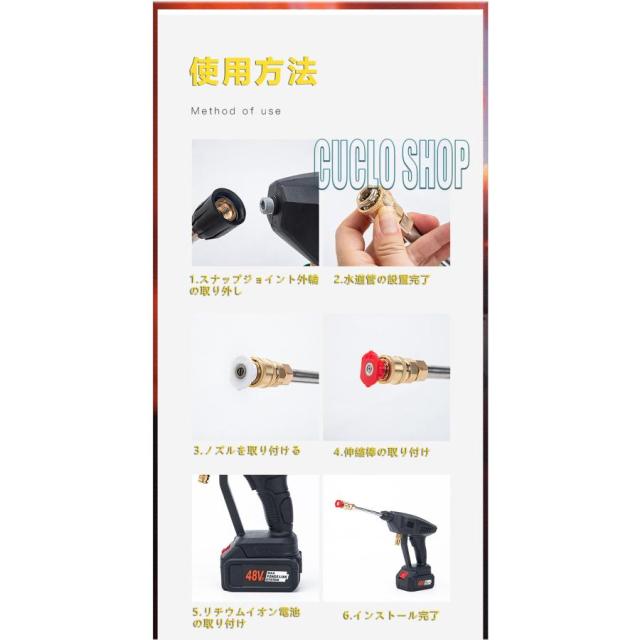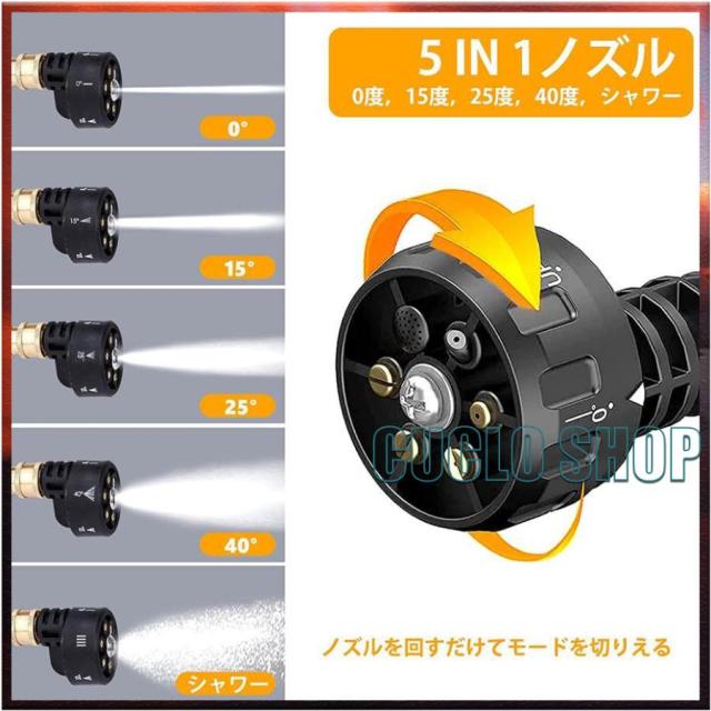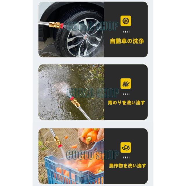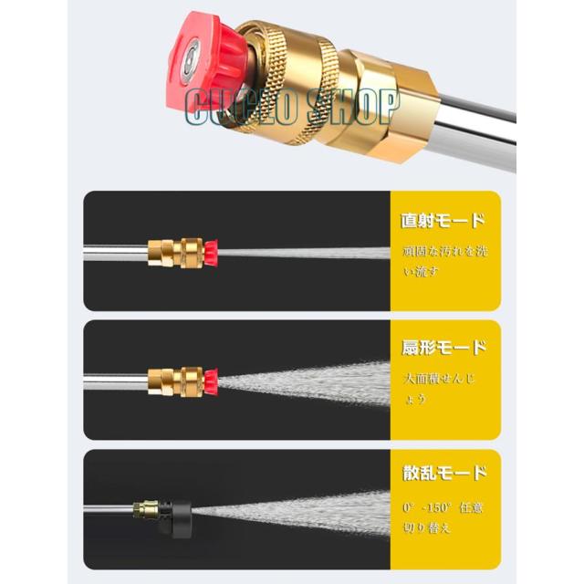 ◇高圧直噴 泥やコケなど頑固な汚れをピンポイントで洗浄。 ◇ファンジェット(拡散) ベランダや外壁など広範囲の洗浄・すすぎに。 ◇シャンプーボトル 車や外壁用など洗浄剤の散布に。