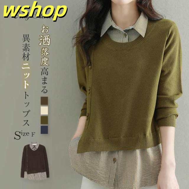 ニット セーター レディース フェイクレイヤード トップス 秋 冬 ニット セーター 長袖 シャツ プルオーバー ニットソー 切り替え ドッキング ニット レイヤード風 重ね着風 シャツ襟 上着 無地 通勤 OL おしゃれ かわいい ゆったり 30代 40代 50代 トップス 着痩せ 通勤 新作 上品 可愛い 通勤 OL 大人