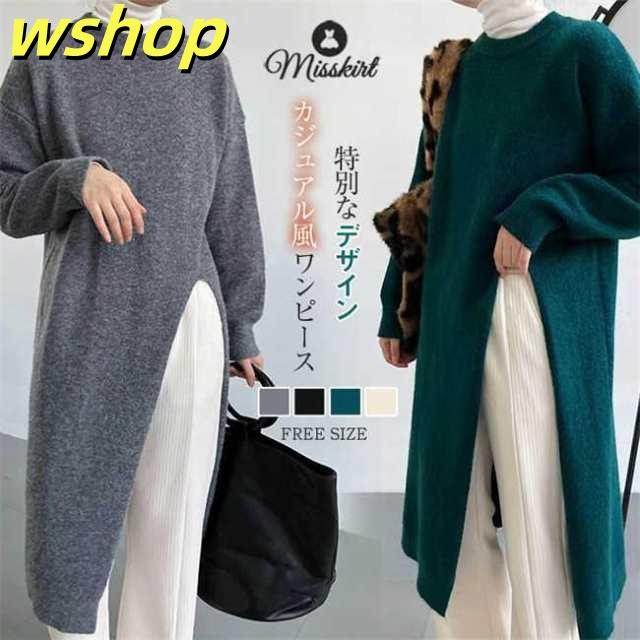 ワンピース セーター ニット レディース ロングワンピース スリット 長袖 ロング プルオーバー ラウンドネック 体型カバー 無地 ゆったり シンプル 大きいサイズ 春 秋 冬 秋服 新作 20代 30代 40代 50代 通勤 OL リラックス カジュアル おしゃれ 送料無料