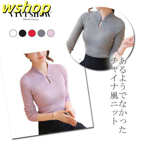 季節限定アイテム 店長太鼓判 レディース 細リブ編み おしゃれ 長袖 チャイナ風 トップス 春秋冬 売上急増中 送料無料 細身 【wshop ファッション きれいめ 中国風 話題商品 無地 】ニットセーター お買い得プライス