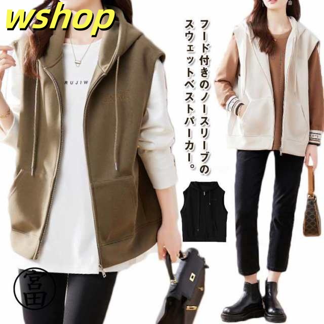 ベスト パーカー レディース 春 秋 前開き トップス フード付き ジップアップ パーカーベスト ノースリーブ ゆったり 重ね着 レイヤード スウェッ