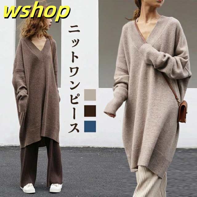 在庫限りの大特価 毎日使える便利品 チュニック 大人 ランキング常連 】ニットワンピース ワンピ フェミニン 着?せ 伸 長袖 ニットワンピ 上品 無地 カジュアル リラックス リブニット レディース 膝丈 春秋 Vネック 話題商品 【wshop 送料無料 数量限定入荷