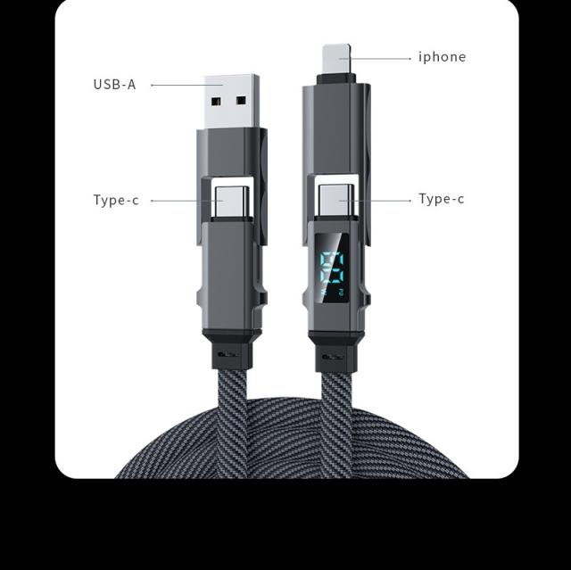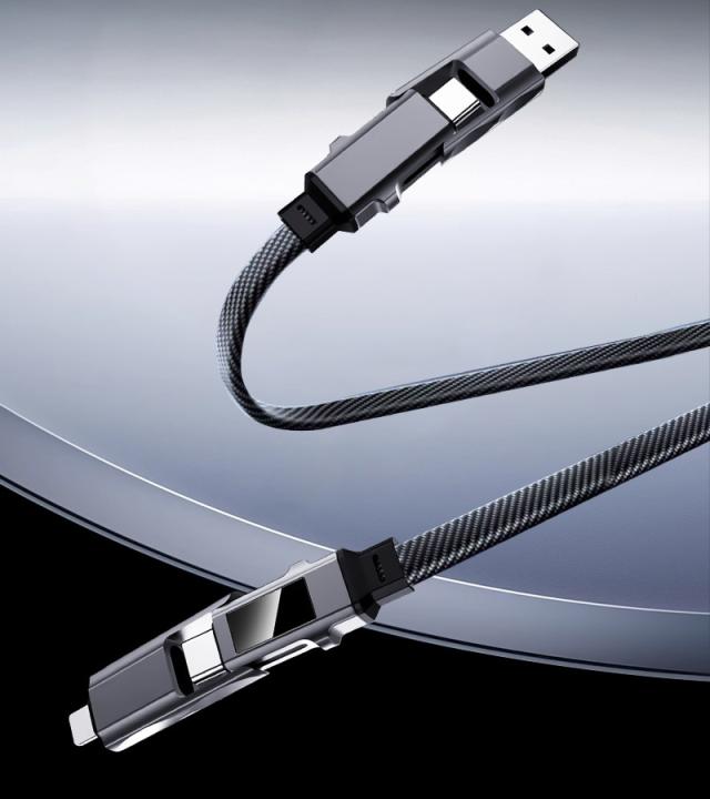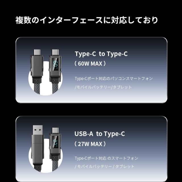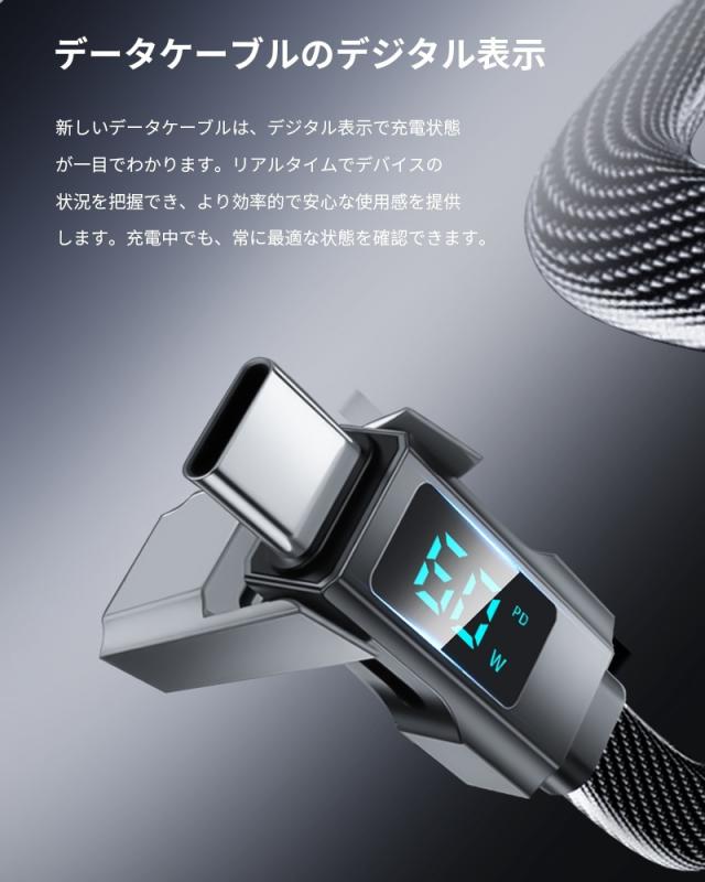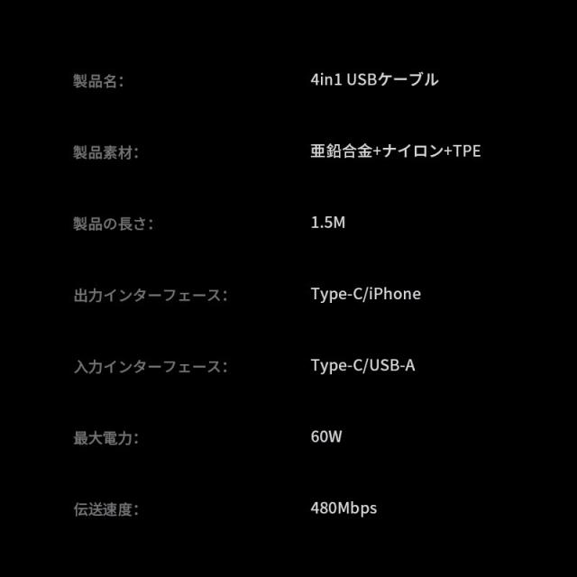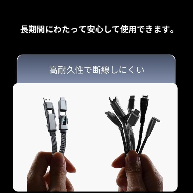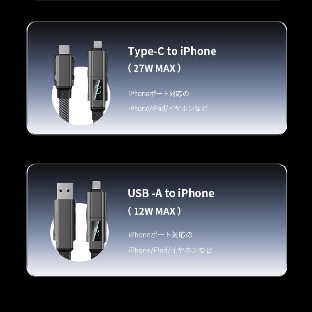 デバイスに合わせてコネクターを付け替えられる4in1 USBケーブルです。「USB-A to iPhone」「USB-A to Type-C」「Type-C to iPhone」「Type-C to Type-C」の4パターンで活躍がします。幅広い互換性で、iPhone・Android・モバイルバッテリーなどの様々な機器に対応し、これ1本で、様々なデバイスの充電やデータ転送の需要を満たします。複数のケーブルを用意する煩わしさを解消できます。