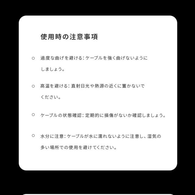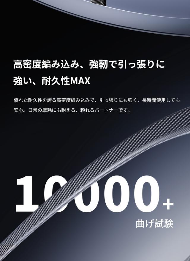 耐挿抜の合金コネクタを採用しており、繰り返しの差し込みと抜き出しや保管にも耐えられるほど強力です。強靭なナイロン編み製ケーブル被覆なので断線を防ぎ、長期間安全に充電をすることができます。