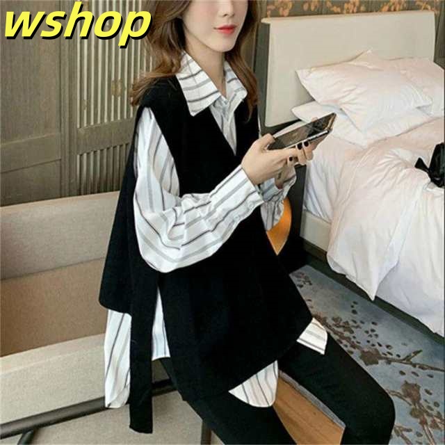 在庫限りの大特価 ギフトにも最適 【wshop ニットベスト ベスト レディー 収納便利 シャツ タンクトップ スリット ロングシャツ 長袖 】ベスト+シャツ2点セット SNS話題 今だけ ブラウス おうちで洗える Vネック ジレ セットアップ 数量限定入荷