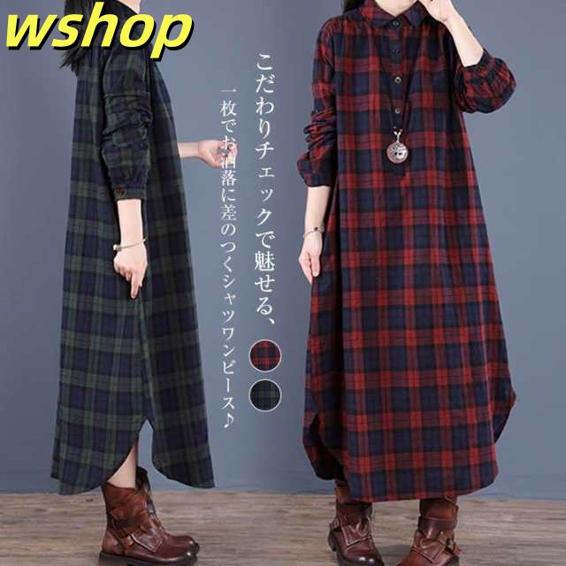 秋の新作特集 品質安心 話題商品 ワンピース ランキング常連 春秋 】シャツワンピース チェック柄 長袖 送料無料 ロング丈 【wshop ロングシャツ 綿麻風ワンピース ロングワンピース 秋冬 レディース 大きいサイズ ロングシャ 即納対応中