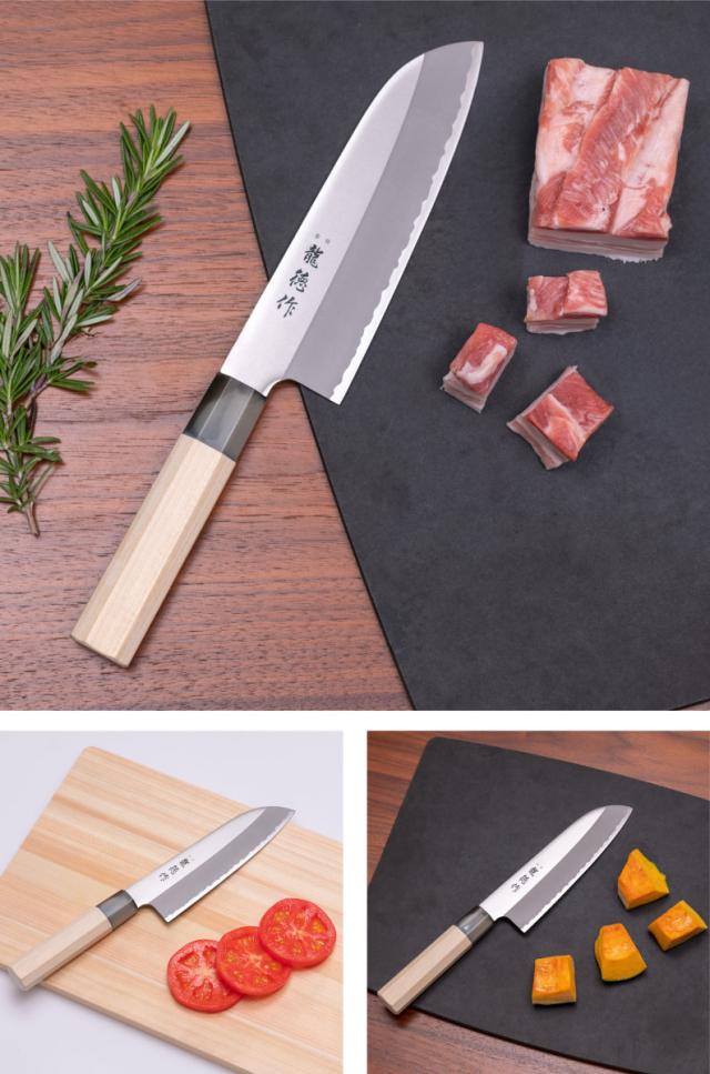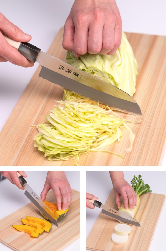 肉や魚、野菜など幅広い食材に対応できる万能包丁です。様々なお料理をこれ一本でまかなうことができ、一般家庭でもオールマイティーに活躍します。