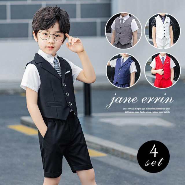 子供スーツ 半袖 4点セット 半ズボン シャツ ブルー グレー ピンク 発表会 スーツ 男の子 スーツ キッズ フォーマル 男の子 子供服 夏
