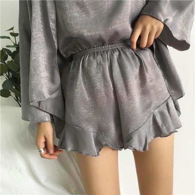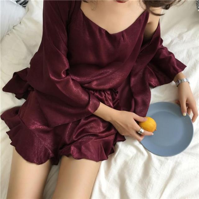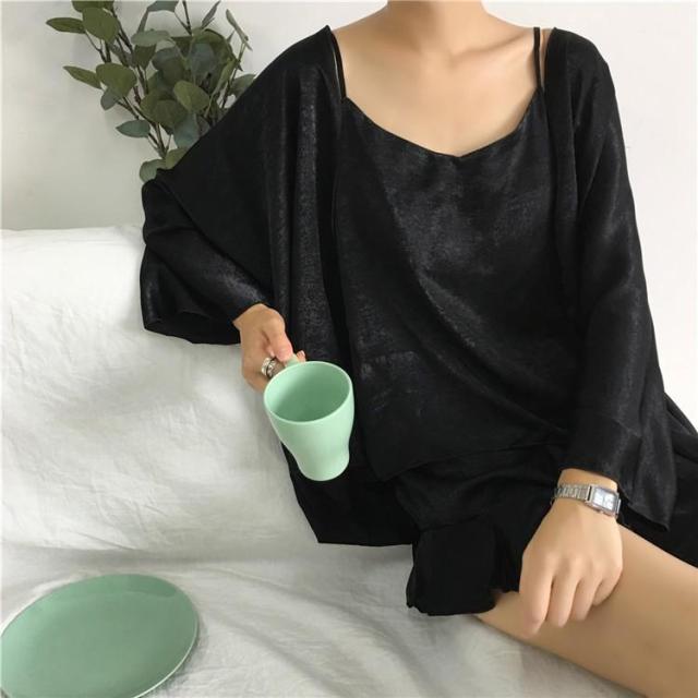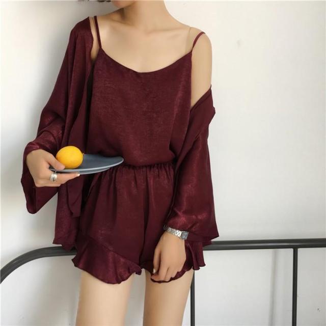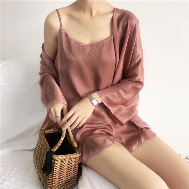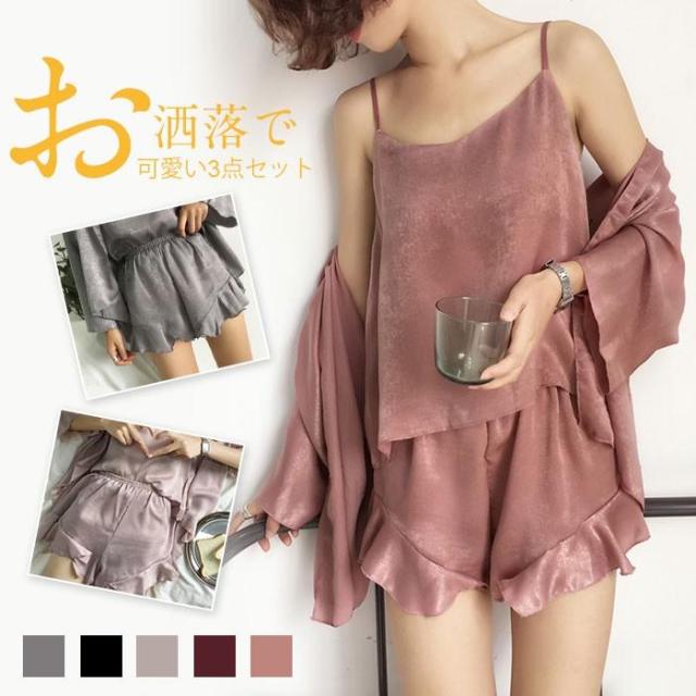 パジャマ レディース 3点セット 春夏 ルームウェア 前開きパジャマ シルク 無地 キャミソール ショートパンツ 寝間着 部屋着 体型カバー 韓国 可愛い