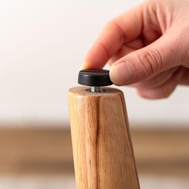 脚部には優しく穏やかな木目、滑らかな触り心地の天然木ラバーウッドを使用しています。