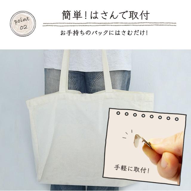 工具を使ってしっかり固定するだけで、後付け可能。バッグやポーチ、衣類にも使えます。