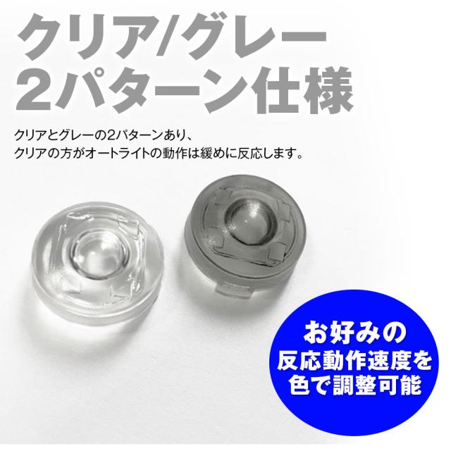クリアとグレーの2パターンあり、クリアの方がオートライトの動作は緩く(遅く)あります。 お好みで調整可能です。 - 取付キットで取付簡単