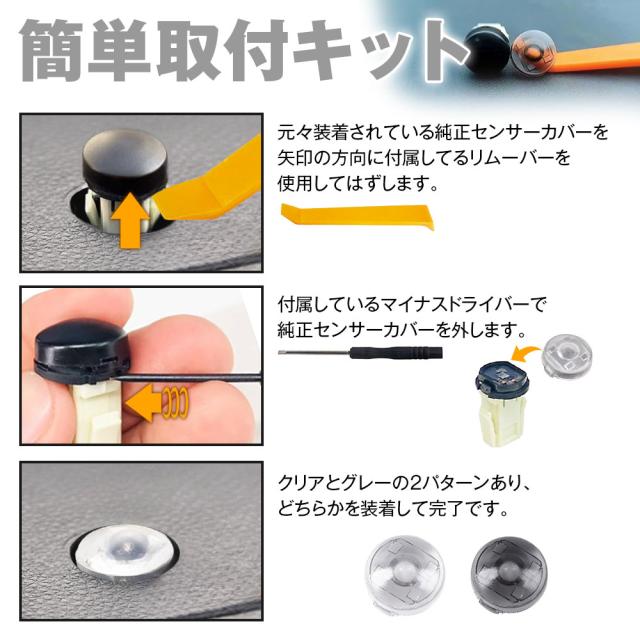 半透明のセンサーカバーに交換するだけで、オートライト感度を下げて、適切なタイミングで作動するように調整できます。クリアとグレーの2色展開でお好みの感度にご調整いただけます。取り付けキット同梱であり、簡単で幅広い車種に対応可能です。