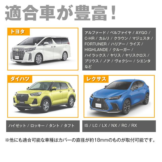 アルファード/ヴェルファイア/アイゴ/C-HR/カムリ/クラウン/マジェスタ/フォーチュナー/ハリアー/ライズ/ハイランド/クルーガー/ハイラックス/ヤリス/ヤリスクロス/プリウス/ノア/ヴォクシー/シエンタなど