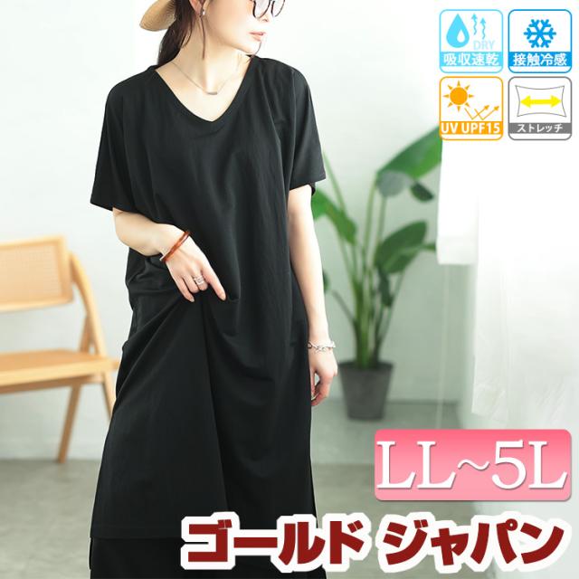 秋新作 大きいサイズ レディース ワンピース UVカット&接触冷感ストレッチ鹿の子サイドスリットワンピース ワンピ 半袖 Vネック ドルマン UVカット UV 接触冷感 ストレッチ ドライ スリット ロング ゆったり 春服 夏服 秋服 LL 2L 3L 4L 5L ブラック 黒 ゴールドジャパン