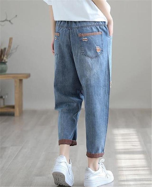 デニムパンツ レディース サルエルパンツ 九分丈 ダメージ加工 ウエストゴム ワイドパンツ 体型カバー ゆったり カジュアル 大き