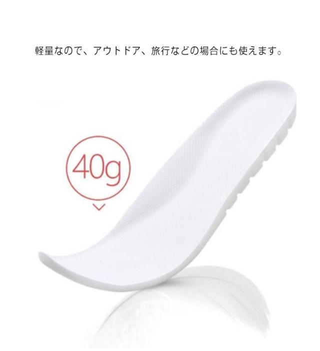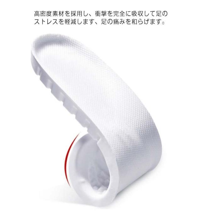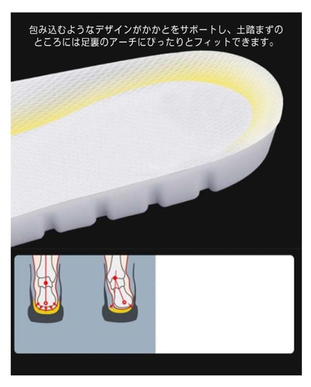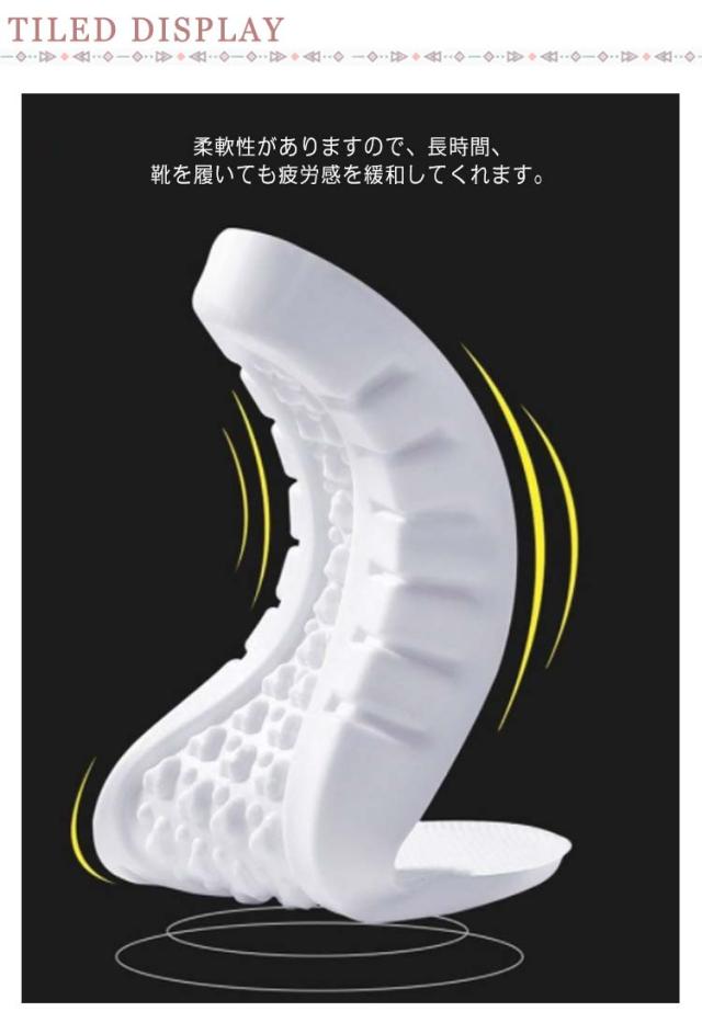 | 運動、歩行などを快適に体験!柔らかいインソールです。 包み込むようなデザインがかかとをサポートし、土踏まずのところには足裏のアーチにぴったりとフィットできます。 高密度素材を採用し、衝撃を完全に吸収して足のストレスを軽減します、足の痛みを和らげます。 柔軟性がありますので、長時間、靴を履いても疲労感を緩和してくれます。 軽量なので、アウトドア、旅行などの場合にも使えます。 | |