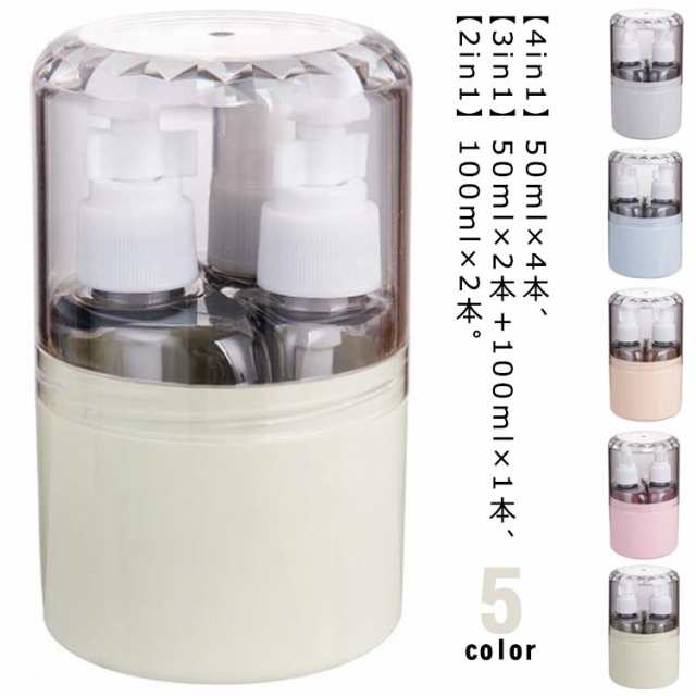 | 【4in1】50ml×4本、【3in1】50ml×2本+100ml×1本、【2in1】100ml×2本。 シャンプーやコンディショナー、スキンケア用品などを一緒に入れることのできる、50ml&100ml容量のボトルが登場しました。 収納ケース(7.2cm×12cm)は機内持ち込み可能サイズです! 旅行や出張だけでなく、日常生活での様々なシーンで活躍します。 ボトルは自立して置けるデザインになっており、外から内容量が見える透明なので、残量が一目でわかります。補充のタイミングを逃しません! 注ぎ口が大きく入れやすい。フタも取りやすいため、楽に補給できます。 海外旅行、銭湯・サウナ、お泊り、キャンプ、プール・海など国内外どこでも活躍します! 用途に合わせて1つのボトルに詰め替えてください。 | |