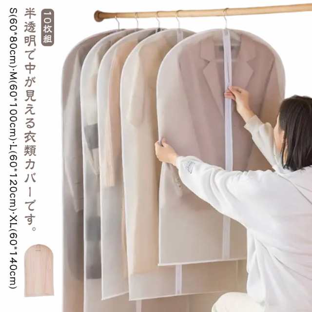 | 半透明で中が見える衣類カバーです。【10枚組】【S(60*80cm)?M(60*100cm)?L(60*120cm)?XL(60*140cm)】 防水性と通気性の優れたPEVAで作られているため大切な洋服などをホコリ、カビ、虫、汚れや湿気からしっかり守って綺麗に収納出来ます。普通の不織布製カバーより防塵・防水性能が抜粋です。 洋服カバーは半透明なデザインで、中身が見やすいです。ファスナーが付き、ハンガーのフックを通す穴ありますので衣類の出し入れが簡単で便利です。それに、カバーの底部は縫製されておりますのでしっかりホコリを防止できます。 洋服カバーが汚れた場合、濡れた布で拭きすぐに綺麗になります。また、洗濯の利く生地なので長期間繰り返して使用可能です。使用しないときには簡単に折り畳むことができます。 クローゼットの中が整理でき、きれいに片付けます。スペースを無駄なく有効活用して、見た目もスッキリです。 ※ハンガーは付属しておりません。 | |