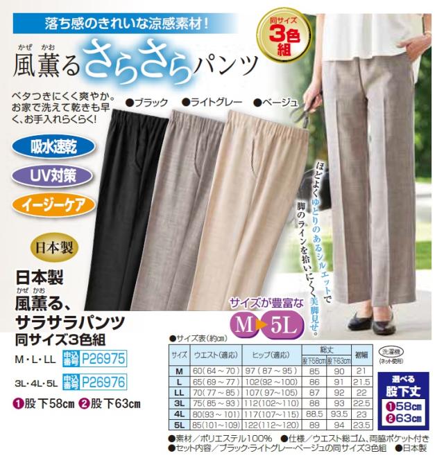 日本製 風薫る、サラサラパンツ 3色組 M L LL 選べる股下丈 イージーパンツ スラックス レディース 婦人服 ミセス シニア 女性 センタープレス ブラック グレー ベージュ 黒 灰色 薄茶色 サマーパンツ 無地 50代 60代 70代 80代 90代 母の日 お母さん 春夏 fri p26975
