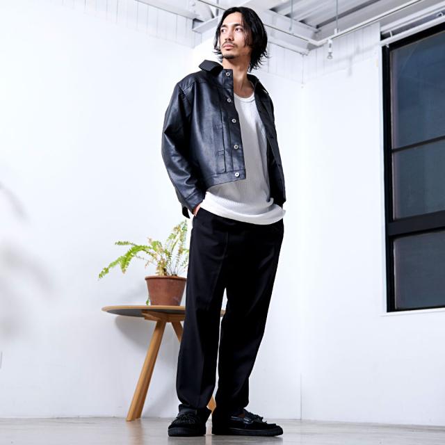 スラックスと合わせて、シンプルながらも上品なスタイリングに。