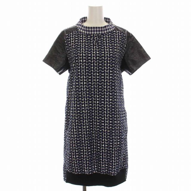 【中古】サカイラック sacai luck ワンピース ひざ丈 チェック レース 切替 半袖 青 ブルー 黒 白