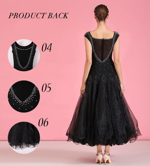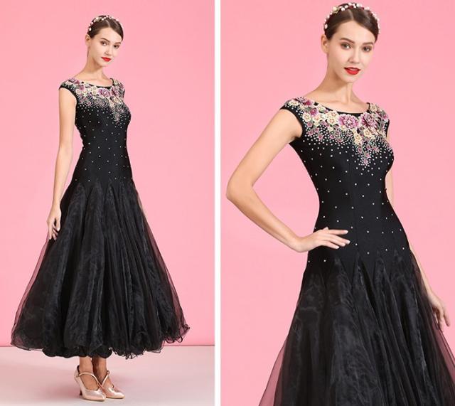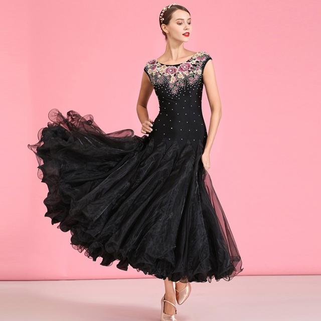 高品質 社交ダンス ドレス 社交ダンス衣装 花柄 初心者 練習着 広がる裾 発表会用 ワンピース パーティー スタンダード レッスン着 発表会 競技着 演出用 開場ドレス ワルツ専用ドレス ロング丈 オールシーズン ブラック S M L XL 2XL be199zbzbm5