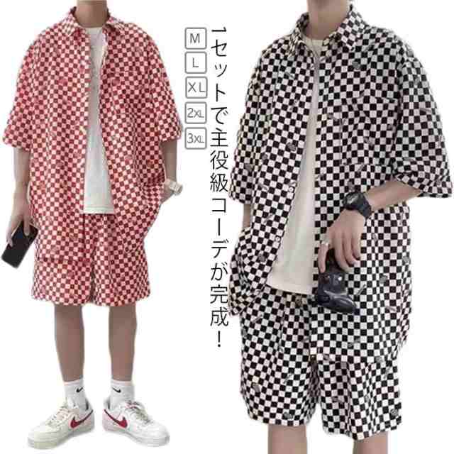柄シャツ セットアップ メンズ 半袖 シャツ ショートパンツ ハーフパンツ 2点セット チェッカーフラッグ柄 ゆったり 大きいサイズ 夏 海 川 リゾート 総柄シャツ アロハシャツ セットアップ カジュアル おしゃれ ストリート 夏休み