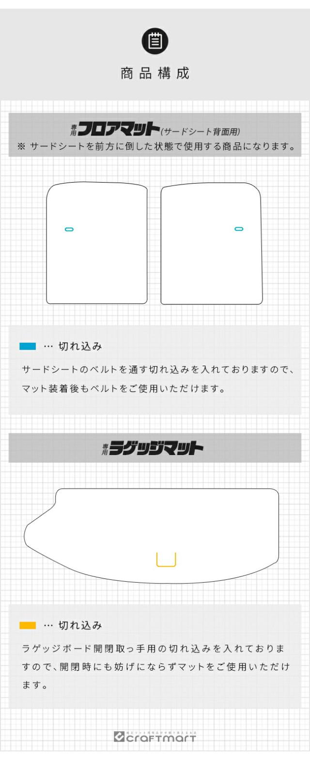 | 商品構成 | 専用フロアマット(サードシート背面用) 2枚 専用ラゲッジマット 1枚 |