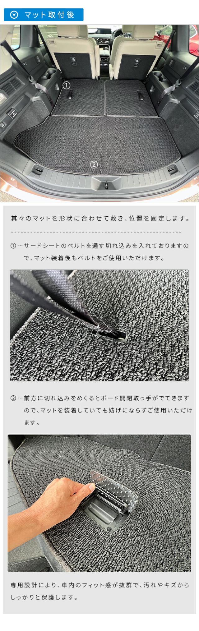 | 商品のポイント | 当商品は、サードシートを前方に倒して使用するフロアマットとラゲッジマットの3枚組になります。専用設計により、車内のフィット感が抜群で、汚れやキズからしっかりと保護します。6人乗りや7人乗りのモデルに対応しており、内装をカスタムするアクセサリーとしても優れています。高品質な素材を使用し、耐久性も兼ね備えたこのマットは、車内を清潔に保ちつつ、スタイリッシュな印象を与えます。 |