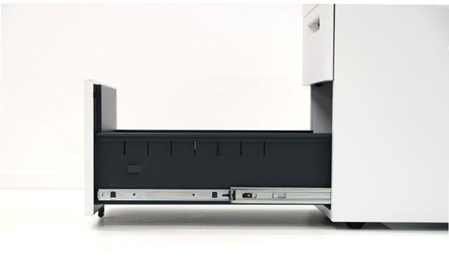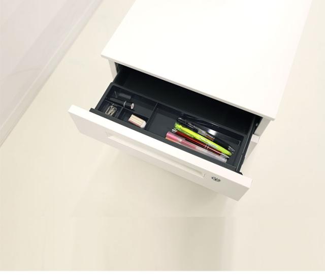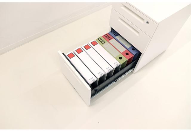 最下段の引き出しには、ダブルサスペンションレールを採用。フルオープンで収納物の出し入れがしやすく、引き出しの一番奥までフル活用でたっぷり収納。A4ファイルは縦にも横にも収納可能です。