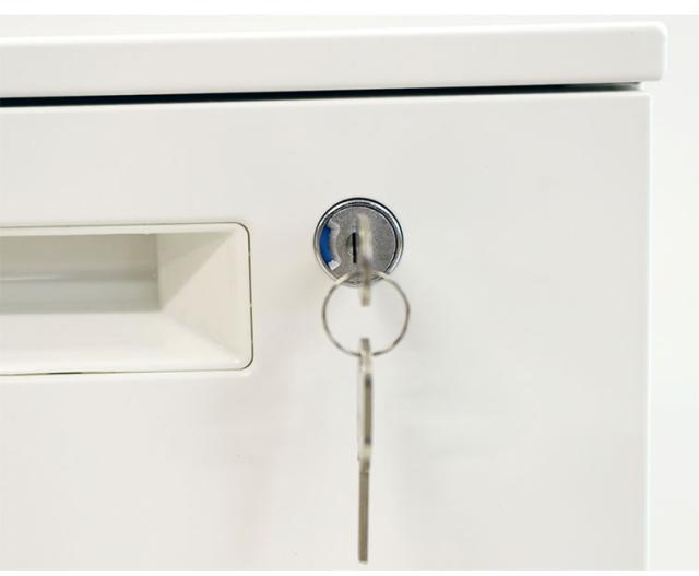 上段の鍵を施錠するとすべての引き出しがロックされる全段オールロック式。鍵の状態が一目でわかる開閉表示も付いていて、セキュリティ対策も万全!