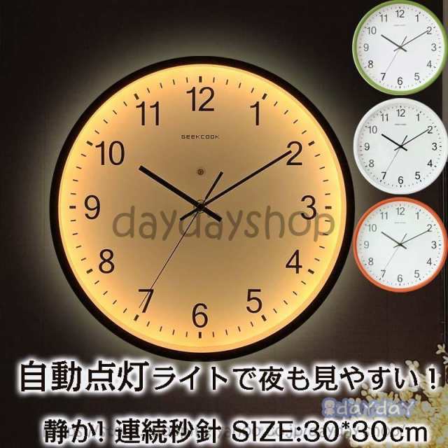 壁掛け時計 自動点灯 ライト付き 光明 連続秒針 クロック 北欧風 時計 壁掛け アナログ 点灯 静か とけい 壁 掛け 光る リビング ダイニング スイープ秒針