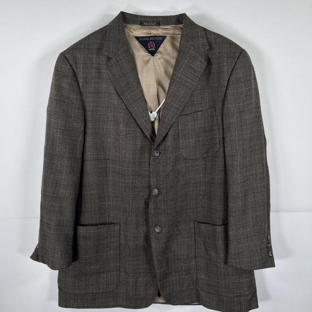 USA古着 トミーヒルフィガー TOMMY HILFIGER テーラードジャケット ブレザー スーツ ウール 大きいサイズ 44 ブラウン チェック メンズ