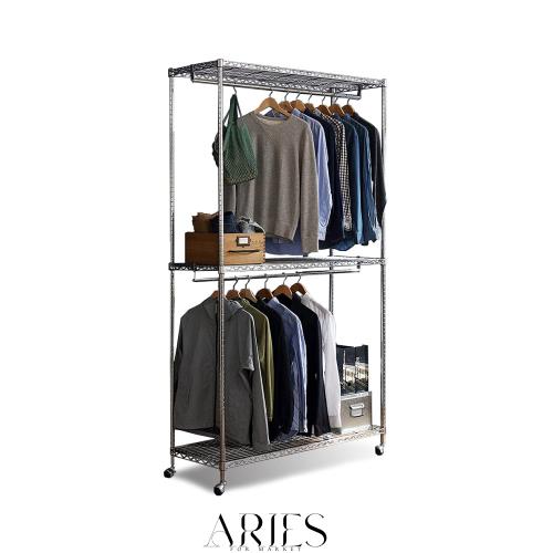 ◆POINT03.超高耐荷重325kg 頑丈で丈夫なつくりでガレージや物置使用も余裕の、超高耐荷重仕様。 倉庫などで物置としての使用にも最適。 掛けやすく、落ちにくいハンガーポールが上下で2本付いており、洋服を綺麗に飾れます。 耐久性と通気性を兼ね備えたワイヤー構造は光を遮らず、お部屋の雰囲気が重たくならない。 キャスタータイプで、移動もらくらく。 掃除や模様替えの際にも、困りません。