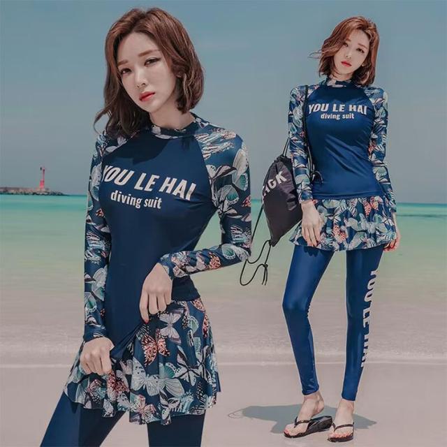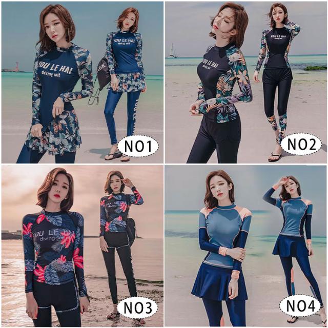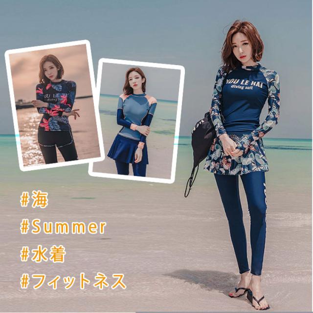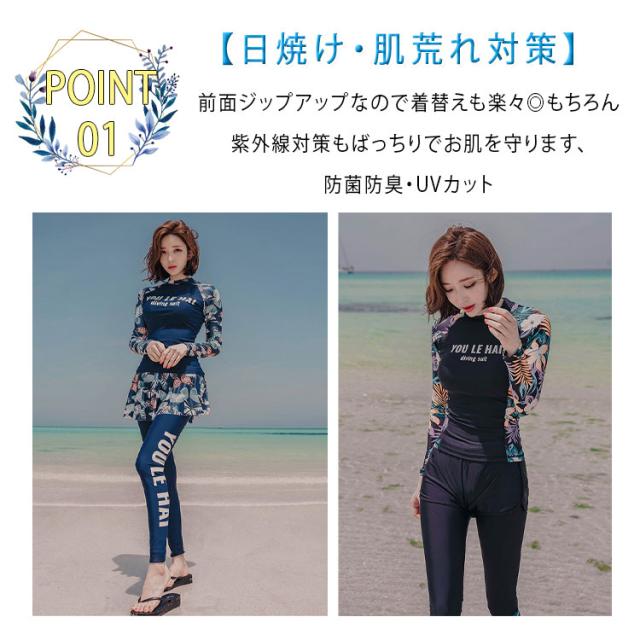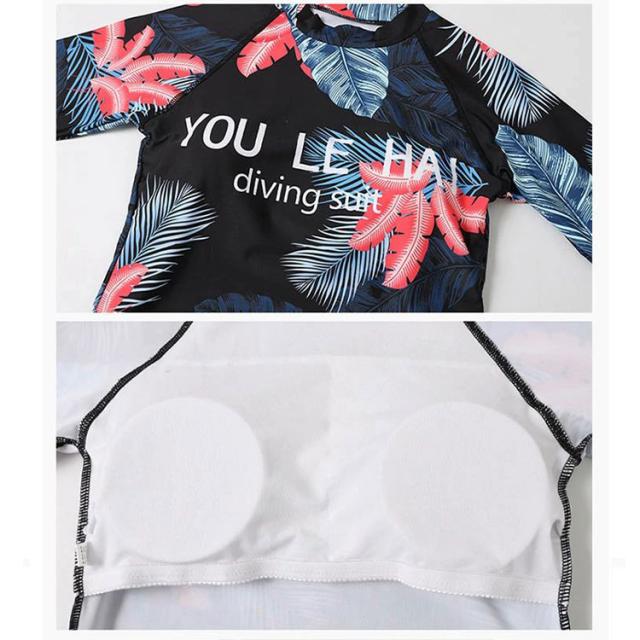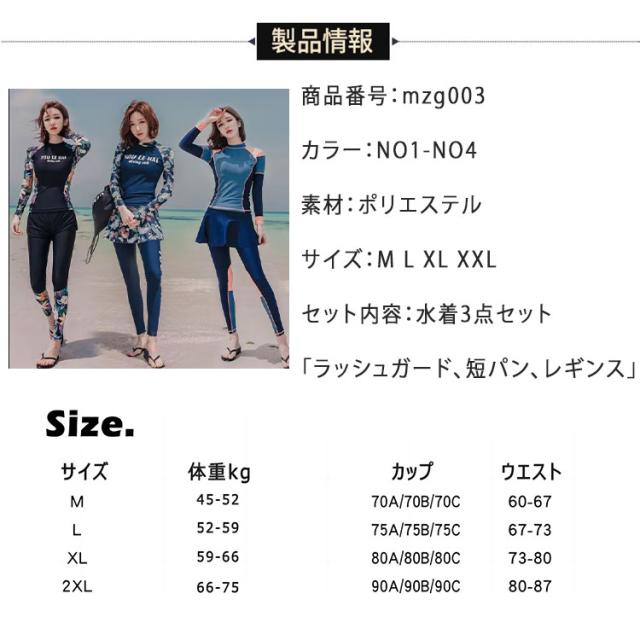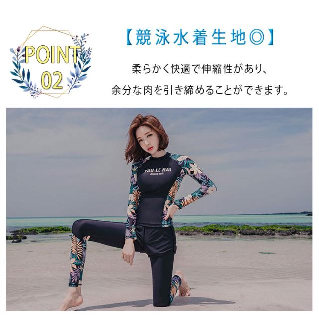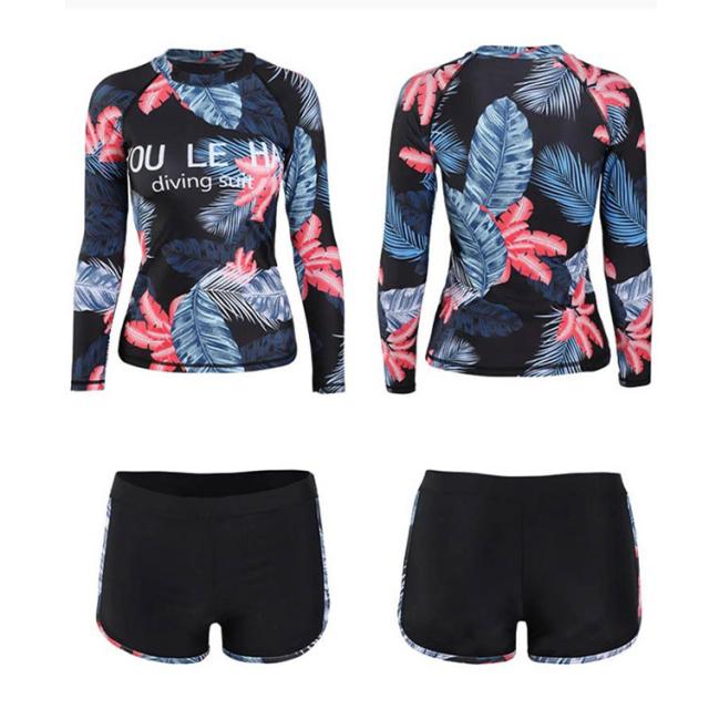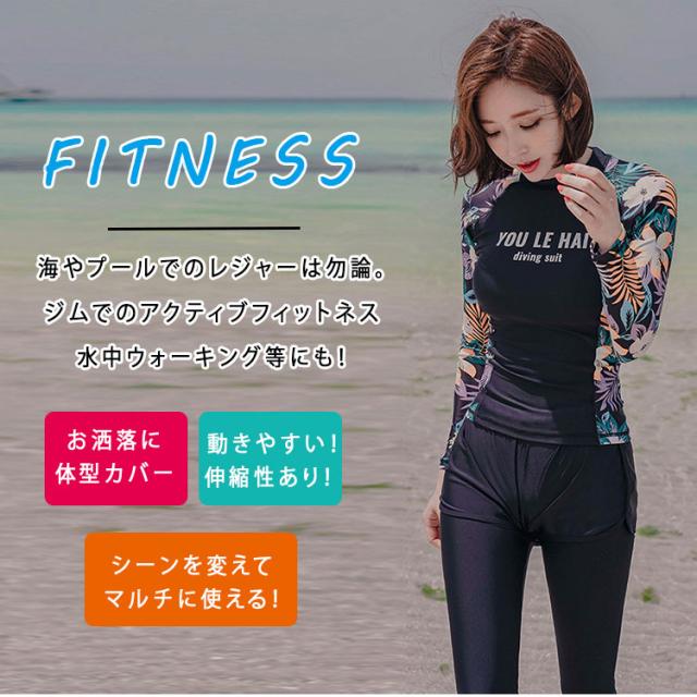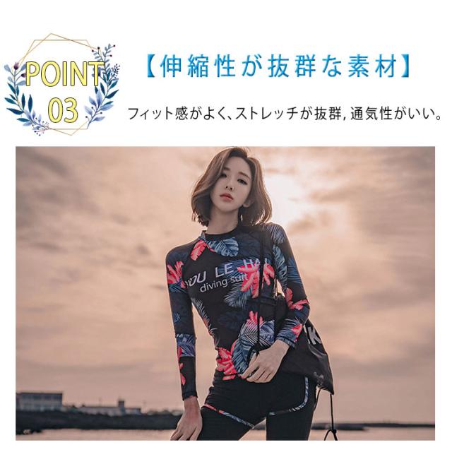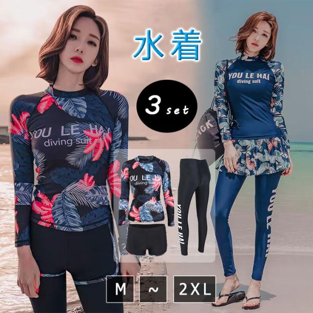 水着 フィットネス レディース水着3点セット 長袖ラッシュガード&短パン&ラッシュレギンスの3点 長袖トップス パッド付き ノンワイヤー M L XL XXL 大きいサイズ 体型カバー ハイビスカス柄