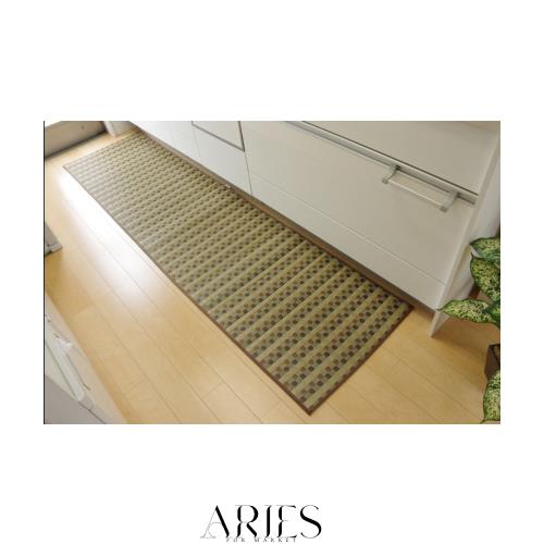 い草のキッチンマットです。キッチンマットの不満を解消してくれる商品です。 化繊もののキッチンマットと比べ、汚れにくくシミになりにくいです。 小さなゴミでも、ほうきで掃く、掃除機をかけるだけで取り除くことができます。い草自体が持つ油分により汚れを弾くので洗う必要がなく長くご使用いただけます。 裏地にはウレタンフォームを使用しクッション性を持たせています。