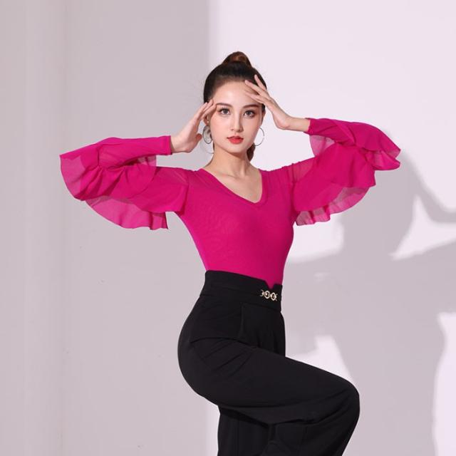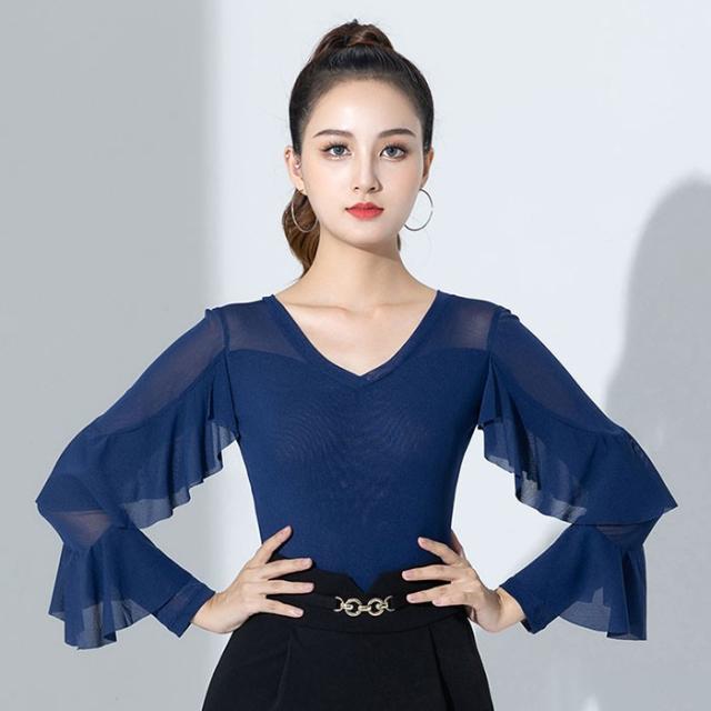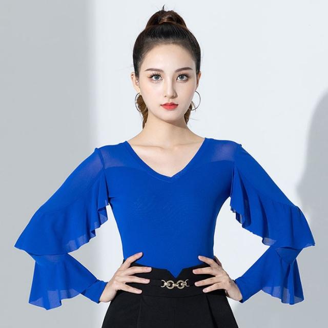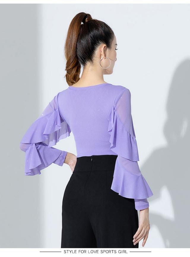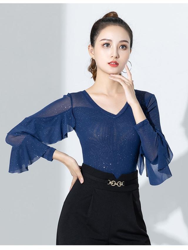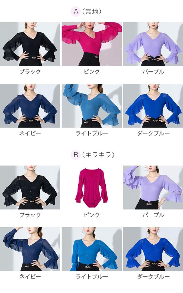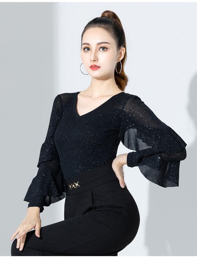 トップス レオタード 社交ダンス衣装 女性 キラキラ レッスンウェア 上着 競技着 練習着 演出着 モダン ラテン ダンス用上着 ダンスウェア レディース ダンス衣装 ダンス ステージ 衣装 ダンストップス 大きいサイズ フリル 長袖 チャチャチャ 黒