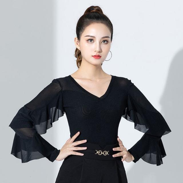 トップス レオタード 社交ダンス衣装 女性 キラキラ レッスンウェア 社交ダンス 上着 競技着 練習着 演出着 モダン ラテン ダンス用上着 ダンスウェア レディース ダンス衣装 ダンス ステージ 衣装 ダンストップス 大きいサイズ フリル 長袖 チャチャチャ 黒 de023n1n1m5