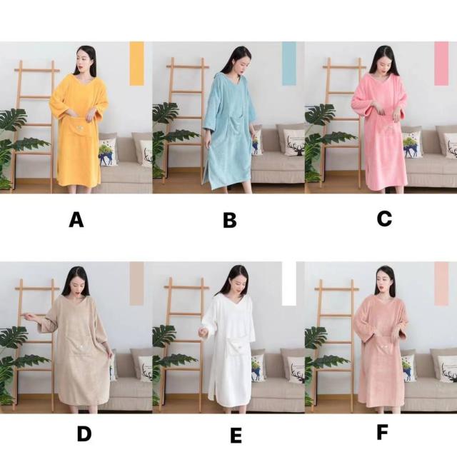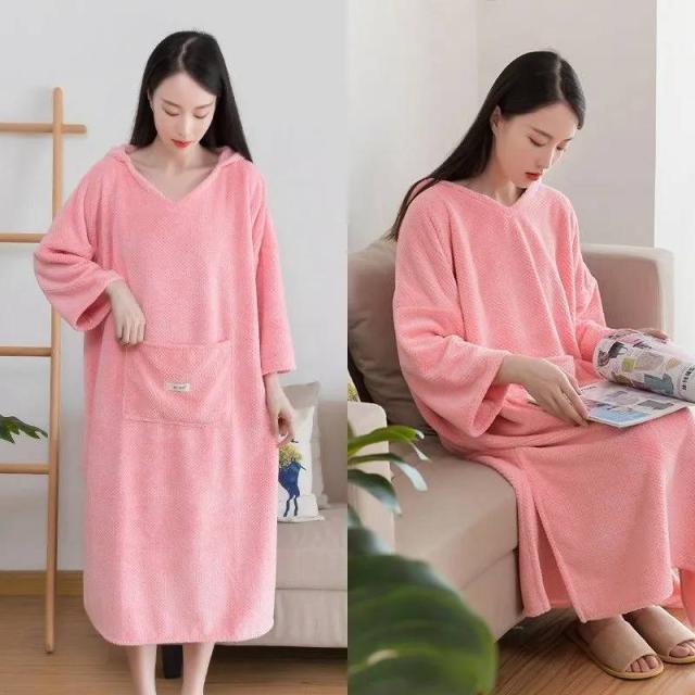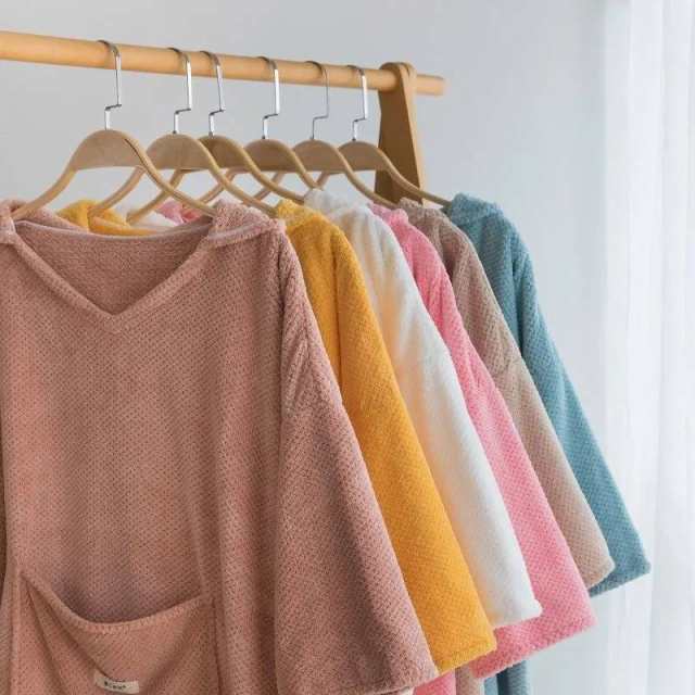 バスローブ フード付き レディース バスドレス マイクロファイバー 吸水 長袖 パジャマ ルームウエア プルオーバー ポケット スリット ミモレ丈 ワンピース 112×68cm かわいい モコモコ