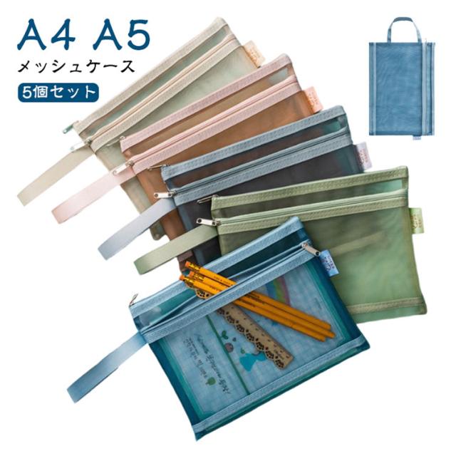 書類入れ 【5個セット】A4 提げ手付き ファイル メッシュケース 書類ケース 大容量 ジッパー付き ポーチ 本 メモ帳 A5 クリアケース 文房具 事務用品 2層 フォルダー 持ち運び 軽量 受験用 【5個セット】A4 ペンケース 文具 バッグインバッグ 整理整頓