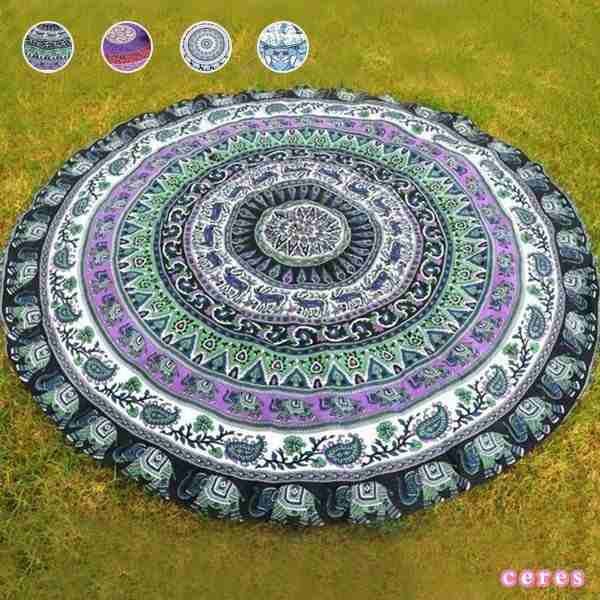 ビーチマット 敷物 ラウンド型 ブランケット ビーチタオル ブルー シフォン 象 幾何学模様 ビーチ小物