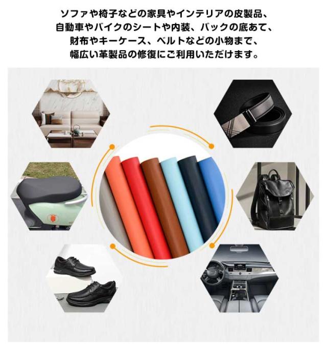 | 全20色×5枚入り! 光沢感を抑えた少しマットな質感の合皮補修シートです。 柔らかく微弾性があり、防水性と耐摩耗性に優れています。 ソファや椅子などの家具やインテリアの皮製品、自動車やバイクのシートや内装、バックの底あて、財布やキーケース、ベルトなどの小物まで、幅広い革製品の修復にご利用いただけます。 好きな形に切って貼るだけだから手芸や洋裁、小物づくりなどハンドメイドにもおすすめです。 粘着シールでしっかり貼り付けできます。 PUレザーで高級感バッチリです。 手芸品や民芸品、工芸品などのDIYにもご利用いただけます。 | |