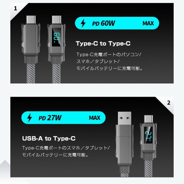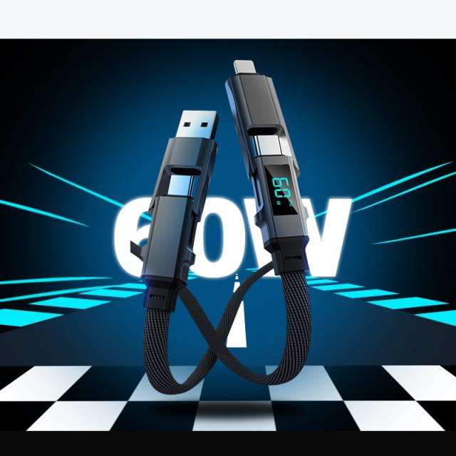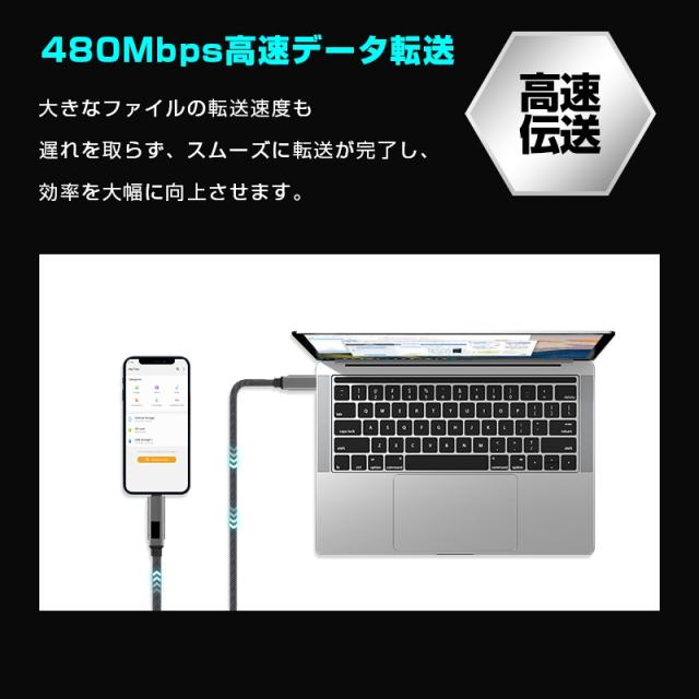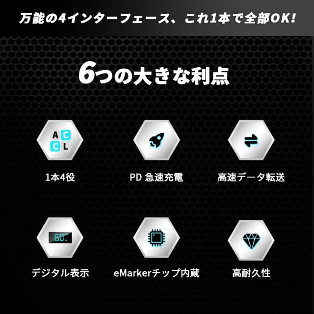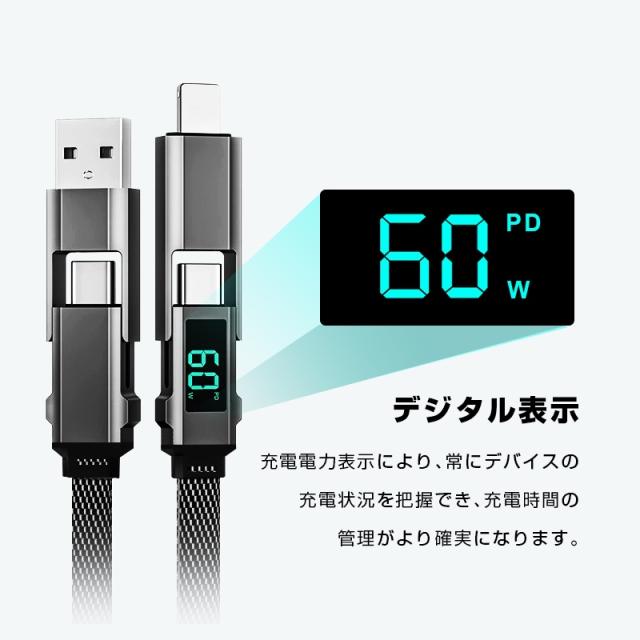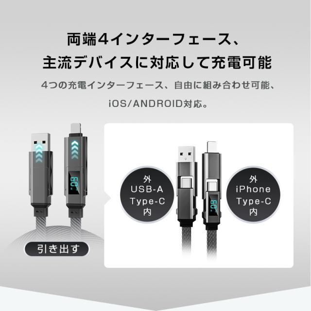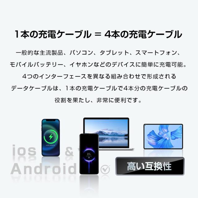 デバイスに合わせてコネクターを付け替えられる4in1 USBケーブルです。「USB-A to iPhone」「USB-A to Type-C」「Type-C to iPhone」「Type-C to Type-C」の4パターンで活躍がします。幅広い互換性で、iPhone・Android・モバイルバッテリーなどの様々な機器に対応し、これ1本で、様々なデバイスの充電やデータ転送の需要を満たします。複数のケーブルを用意する煩わしさを解消できます。
