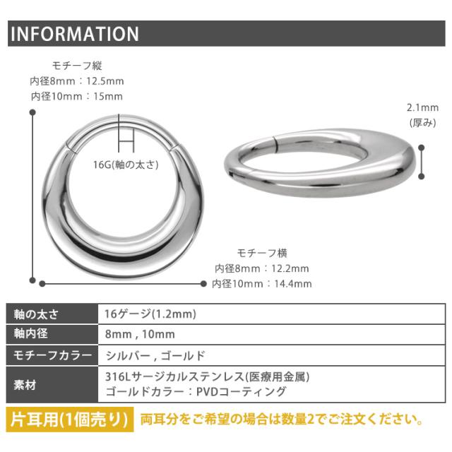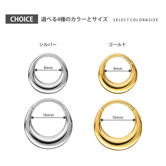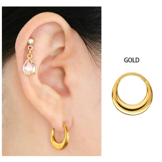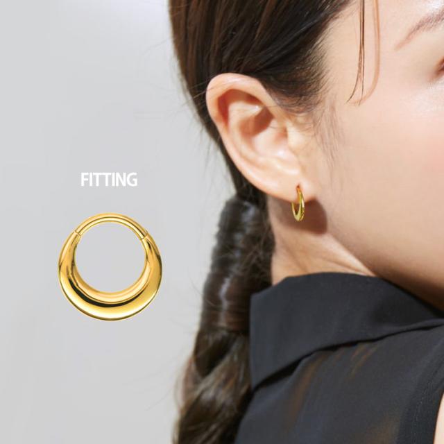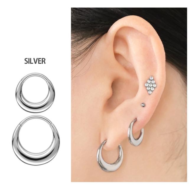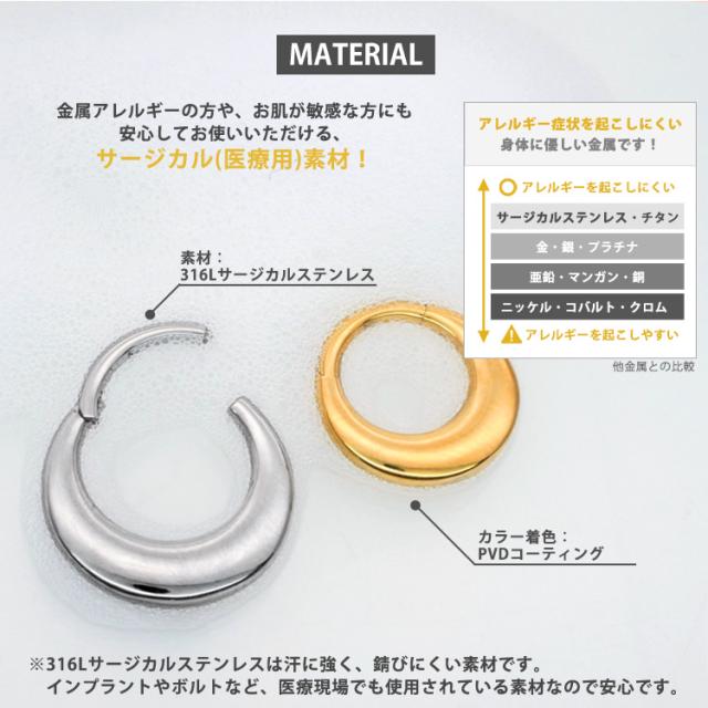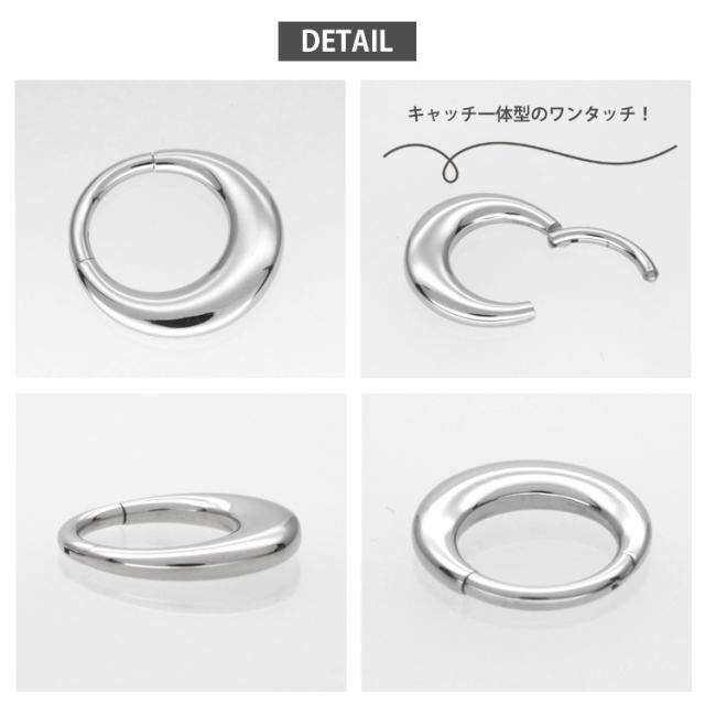 ボリューム感のある、月のようなデザインのフープピアス。 無駄のないフォルムが美しい高見えリングピアスです。 ヒンジで開け閉めできるキャッチ一体型のワンタッチ構造なので簡単で快適な使い心地です。 キャッチをなくす心配もない、不器用さんも安心のクリップリングです。 服やシーンを選ばないシンプルデザインで、オシャレの幅が広がります。 アレルギーが起きにくいALLサージカル(医療用)ステンレス素材なので安心です。
