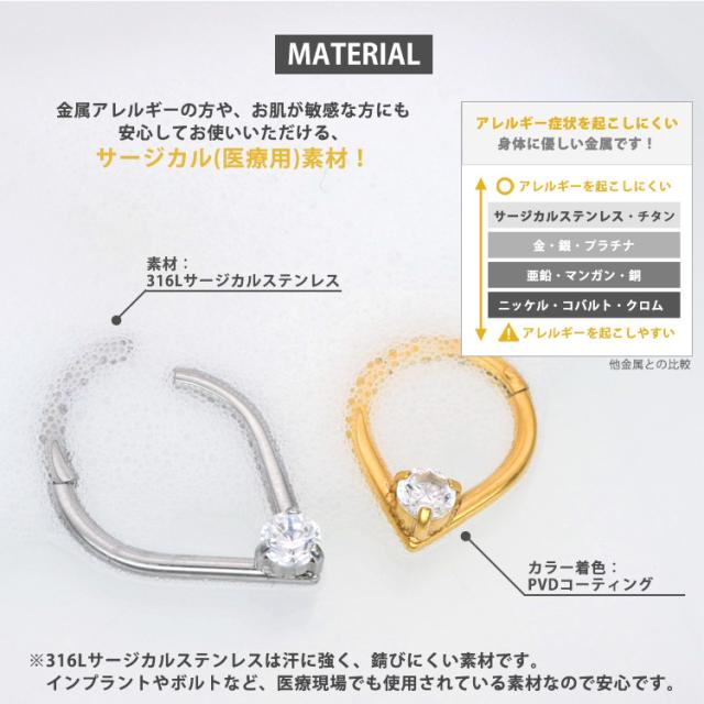 ドロップ型の先端に立爪セットのジュエルがついた珍しいデザインのフープピアス。 無駄のないフォルムが美しい高見えリングピアスです。 ヒンジで開け閉めできるキャッチ一体型のワンタッチ構造なので簡単で快適な使い心地です。 キャッチをなくす心配もない、不器用さんも安心のクリップリングです。 服やシーンを選ばないシンプルデザインで、オシャレの幅が広がります。 アレルギーが起きにくいALLサージカル(医療用)ステンレス素材なので安心です。