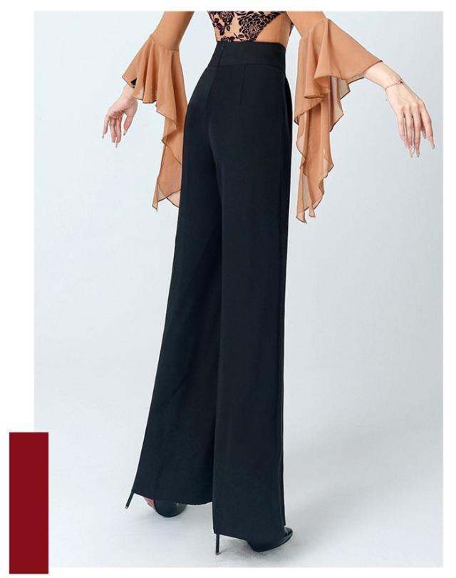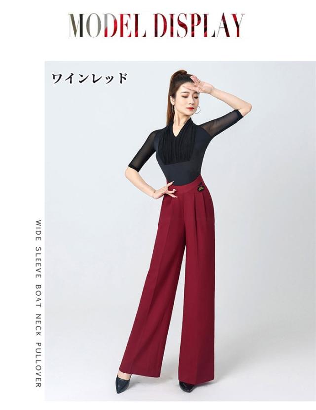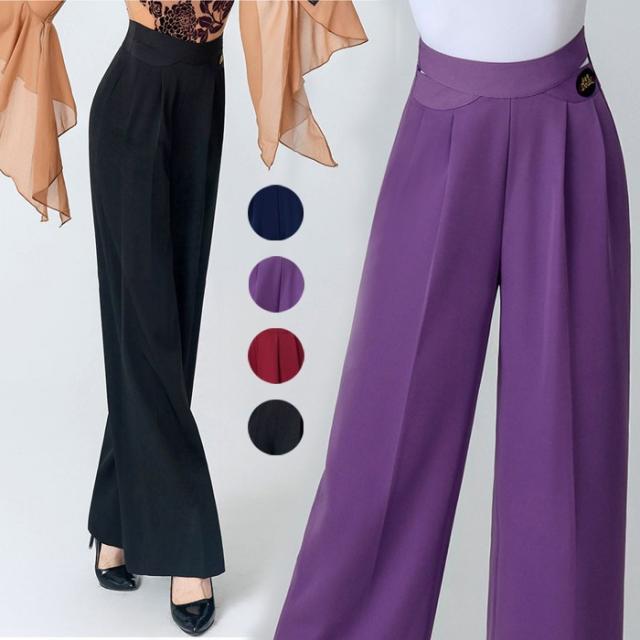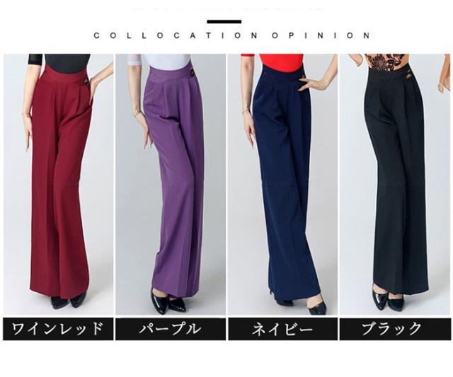 全4色 ダンスパンツ レディース ワイド パンツ ラテンダンスパンツ モダン 社交ダンス 練習着 パンツ ロング 薄手 ゆったり 長ズボン ダンス ボトムス 演出服 着痩せ 大きいサイズ有 ブラックパンツ 黒 パープル ワインレッド ネイビー d1197d7d7m5