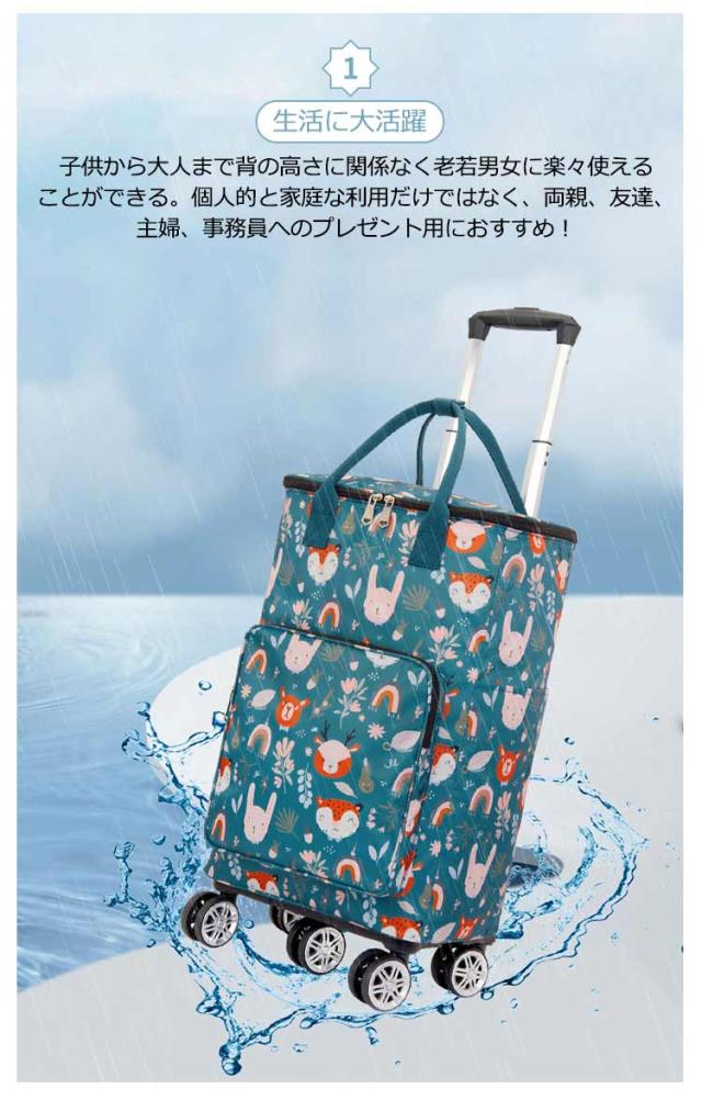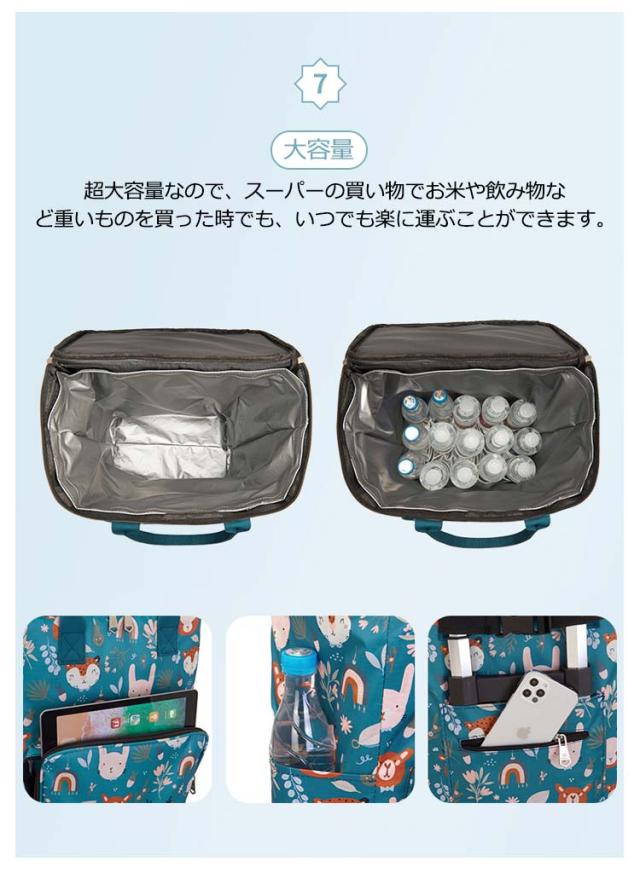 | 防水加工、撥水加工を施した保温保冷機能のショッピングキャリー。 【保温保冷】バッグの内側に保冷保温効果のあるアルミフィルムを使用しており、生鮮食品などの買い物に便利にお使いいただけます。 【折り畳み収納便利】バッグを取り外して、キャリーを簡単に折り畳んでバッグを入ることができます。 【大容量】超大容量なので、スーパーの買い物でお米や飲み物など重いものを買った時でも、いつでも楽に運ぶことができます。 【安定感抜群の5輪】耐久性・安定性に優れたタイヤを採用します。360度回転するので、スムーズに方向を変えやすいです。静音設計により、走行時の音が気になりにくいのはメリットです。 【ハンドルは3段階伸縮可能】乗せる荷物の大きさや使う人の身長に応じて、ハンドルのボタンを押すことで高さが3段階調整できます。 【生活に大活躍】子供から大人まで背の高さに関係なく老若男女に楽々使えることができる。個人的と家庭な利用だけではなく、両親、友達、主婦、事務員へのプレゼント用におすすめ! | |