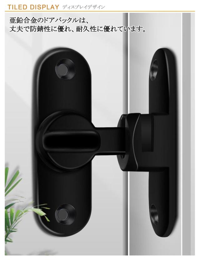 | 【90度/180度兼用&穴あけ不要】 亜鉛合金のドアバックルは、丈夫で防錆性に優れ、耐久性に優れています。 スムーズに回転でき、ワンタッチに簡単に開閉できます。 90度も180度も取り付けられるから、開き戸も引き戸も様々なドアに対応できます。 便利なフリップデザイン、プライバシーロック、フラップは、より快適な生活環境のためにさらなるセキュリティを提供します。 ネジまたは接着剤の2通りの取り付け方法あります。 適切な位置にネジを取り付けるだけで完成し、使いやすい。 子供ケガ防止だけでなく、部屋の外に出ていかないようにしたり、様々な危険を防止できます。 簡単施錠でスライドドアの防犯対策ができます。猫の脱走防止用としてもお使いいただけます。 | |